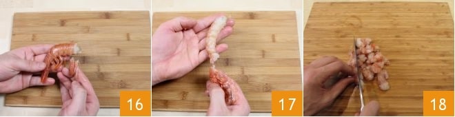Nettoyez les crevettes, en leur enlevant la tête 16, la carapace 17 et l'intestin interne. Posez-les sur une planche à découper et coupez-les grossièrement 18 avec un couteau.