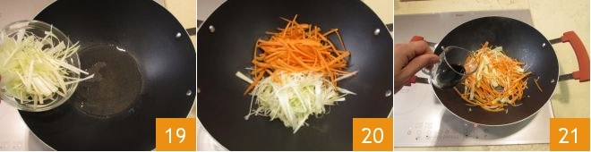 Dans un wok, chauffez l'huile de sésame et ajoutez le poireau 19 et les carottes 20. Laissez fondre pendant quelques minutes et ajoutez environ la moitié de la sauce soja 21.