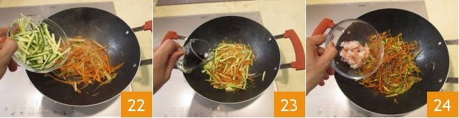 À ce moment-là, ajoutez également les courgettes 22 et assaisonnez avec le reste de la sauce soja 23. Faites cuire le tout pendant 2-3 minutes supplémentaires, éteignez le feu, ajoutez les crevettes 24 et mélangez le tout.