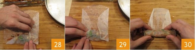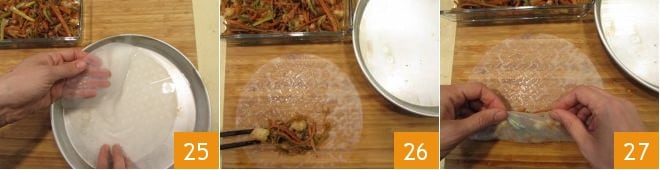 Réhydratez dans l'eau les feuilles de riz 25, posez-les sur une planche à découper et garnissez-les avec la farce, en laissant un bord extérieur d'environ 1,5 cm 26. Repliez la partie la plus longue de la feuille de riz sur la farce 27.