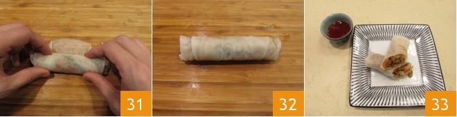 Roulez jusqu'au bout 31 de manière à fermer parfaitement vos rouleaux 32. Répétez cette opération pour les autres feuilles de riz jusqu'à épuisement de la farce. Servez vos rouleaux vietnamiens accompagnés de la sauce aigre-douce 33.