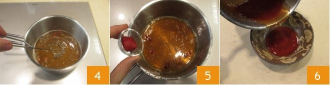 Laissez épaissir à feu doux en remuant souvent 4, pendant environ 10 minutes. Ensuite, ajoutez le concentré de tomate hors du feu 5 et mélangez bien. Laissez reposer votre sauce quelques minutes avant de la verser dans un petit bol 6.