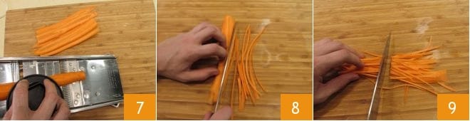 Une fois la sauce prête, consacrez-vous à la préparation des légumes. Lavez bien les carottes, pelez-les et taillez-les. À l'aide d'une mandoline, découpez des tranches d'environ 2 mm d'épaisseur 7. Coupez-les en julienne 8 et ensuite encore en deux 9.