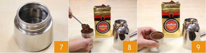 Entre-temps, préparez le café avec la cafetière : pour obtenir un excellent café, remplissez la chaudière de votre cafetière avec de l'eau froide et si possible pauvre en calcaire, en veillant bien à ne pas dépasser la valve de sécurité 7 (sinon, vous obtiendrez un café plus long). Remplissez le filtre avec le café moulu, en formant une petite montagne que vous égaliserez en tapant le filtre sur la table avec des mouvements décidés (8-9). Ne pressez pas avec la cuillère, ni ne faites de trous à la surface.