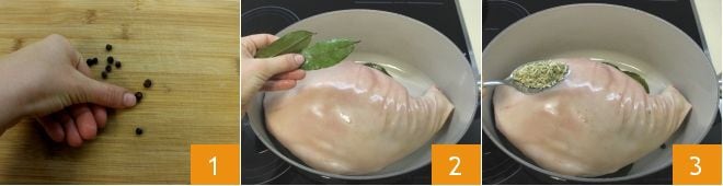 Pour préparer le jambon glacé, écrasez les baies de genièvre 1. Ensuite, prenez une grande casserole, arrosez-la d'un filet d'huile et placez-y le gigot : puis ajoutez les feuilles de laurier 2 préalablement rincées sous l'eau courante, et une cuillère à soupe de graines de fenouil 3.