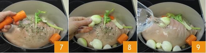 Ensuite, ajoutez également les carottes préalablement pelées et grossièrement coupées 8, les oignons épluchés et coupés en quartiers et les gousses d'ail pelées 8. Puis versez de l'eau dans la casserole 9 jusqu'à couvrir le jambon.
