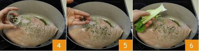 Ajoutez ensuite les grains de poivre 4, les baies de genièvre écrasées, l'anis étoilé 5 et la branche de céleri 6.