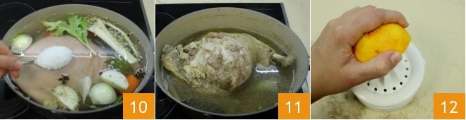 Ajoutez une cuillère de gros sel 10, puis couvrez la casserole avec un couvercle, sans la sceller complètement, et faites cuire pendant au moins trois heures, en retournant de temps en temps le gigot pour qu'il s'imprègne uniformément. Une fois la cuisson terminée 11, le gigot doit refroidir complètement dans la même casserole. Pendant ce temps, vous pouvez préparer le glaçage : pressez le jus d'une orange 12.