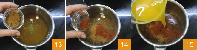 Dans une petite casserole, versez le miel, ajoutez la cannelle 13 et le paprika doux 14 puis versez le jus d'orange 15 et mélangez les ingrédients.