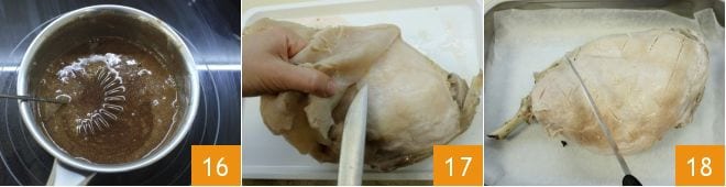 Faites cuire la sauce à feu doux en continuant de mélanger avec un fouet 16 : le glaçage doit devenir assez fluide. Maintenant que la viande et la sauce sont prêtes, vous pouvez retirer la peau du jambon avec un couteau 17. Ensuite, avec la même lame, vous pouvez inciser la surface pour former des losanges 18.