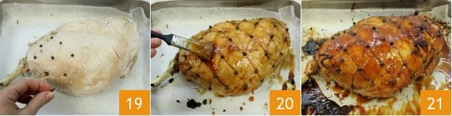 À ce stade, placez le jambon sur une plaque recouverte de papier sulfurisé. Aux points de rencontre entre les incisions obliques effectuées, insérez les clous de girofle 19 afin de créer une décoration ordonnée et géométrique. Ensuite, vous pouvez badigeonner soigneusement le jambon avec le glaçage en vous aidant d'un pinceau de cuisine 20. Puis enfournez dans un four statique préchauffé à 250° pendant 30 minutes (230° pendant 20-25 minutes si four ventilé). Une fois prêt, vous aurez un délicieux jambon glacé 21 à servir à table !