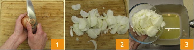 Pour préparer le jarret à la bière, commencez par éplucher les oignons 1, émincez-les pas trop finement 2 et mettez-les dans une grande poêle à bords hauts avec un fond d'huile 3.