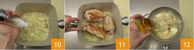 Ajustez le sel des oignons 10 et à ce stade, transférez les jarrets scellés 11. Dans la poêle où vous avez saisi la viande, retirez l'excès de graisse et déglacez le fond avec la bière 12.