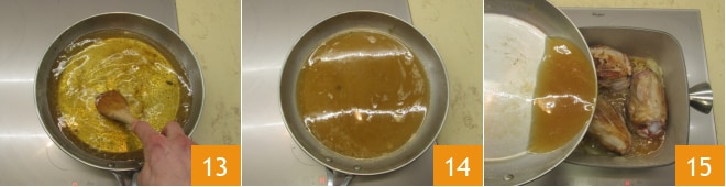 Grattez bien le fond avec une cuillère en bois 13 et faites bouillir le tout pendant environ 5 minutes pour qu'il épaississe un peu 14. Transférez le liquide dans la poêle avec les jarrets 15.