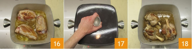 Versez également le Bouillon de viande chaud 16 et couvrez avec le couvercle 17 en laissant cuire à feu doux pendant environ 3 heures et demie 18 : le temps peut varier selon la taille des jarrets.