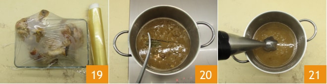 Une fois la cuisson terminée, mettez la viande dans un récipient et couvrez-la avec du film plastique pour qu'elle ne sèche pas 19. Retirez le laurier et le romarin du fond de cuisson 20 et mixez la sauce à l’aide d’un mixeur plongeant 21.