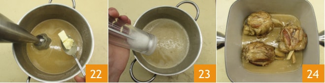 Pendant que vous faites cette opération, ajoutez également le beurre froid en morceaux, ainsi il ne se séparera pas de la sauce 22 et laissez-le s'incorporer. Ajustez éventuellement le sel 23 et réunissez avec la viande. Voilà comment faire le jarret à la bière, dégustez-le chaud 24.