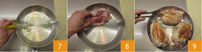 Versez un peu d'huile dans une poêle en acier 7 et scellez les jarrets à feu moyen-élevé d'abord d'un côté 8 puis de l'autre 9 : souvenez-vous que pour retourner la viande, il est toujours préférable d’utiliser des pinces ou des cuillères en bois.