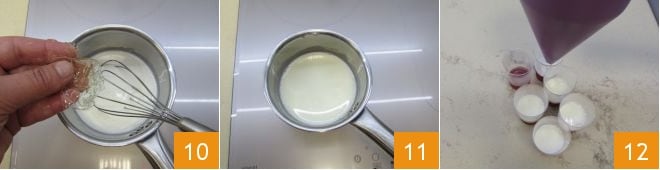 Ajoutez également une feuille de gélatine bien égouttée et essorée 10 et faites-la également fondre jusqu'à obtenir un mélange homogène 11. Éteignez le feu et laissez tiédir la panna cotta. Ensuite, prenez les petits verres que vous aviez mis à prendre au réfrigérateur et versez environ 30 g de panna cotta dans chacun, en vous aidant de l'entonnoir doseur 12. Remettez les petits verres au réfrigérateur pour faire prendre. Cela prendra environ 2 heures.