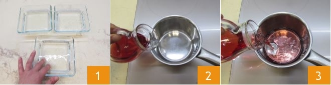 Pour préparer le jelly shot étoilé et rayé, commencez par faire tremper pendant au moins 10 minutes la gélatine dans de l'eau bien froide, dans trois petits bols différents 1, respectivement il faudra 4 g de gélatine pour la couche rouge, 4 pour la bleue et 2 g pour celle de panna cotta. Versez ensuite dans une casserole à bord haut le jus de cranberry 2 et le sirop de fraise 3.