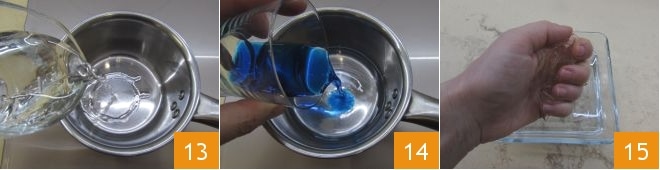 Enfin, préparez la dernière couche de gélatine bleue. Versez dans une casserole la limonade 13 et le curaçao bleu 14. Chauffez à feu doux. Prenez la dernière feuille de gélatine trempée, essorez-la soigneusement 15