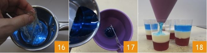 et ajoutez-la dans la casserole 16. Avec les fouets à main, faites fondre la gélatine complètement, puis éteignez le feu. À ce stade, transférez le mélange dans l'entonnoir doseur 17 et versez-en 30 g dans chaque petit verre, maintenant pris, pour réaliser la dernière couche 18. Remettez au frigo pour faire prendre au moins 2 heures.