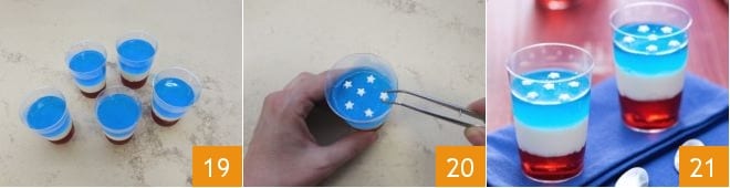 Une fois le temps de prise au frigo écoulé, vous aurez obtenu vos petits verres jelly shot étoilés et rayés. Vous pouvez les décorer avec 6 petites étoiles en sucre chacune pour rappeler le dessin du drapeau américain : prenez les petites étoiles avec des pinces de cuisine et posez-les délicatement sur la couche bleue de gélatine. Maintenant, servez les jelly shots étoilés et rayés et... amusez-vous !