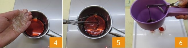 Chauffez à feu doux et ajoutez une feuille de gélatine égouttée et bien essorée 4. Mélangez avec les fouets à main pour la faire fondre complètement 5. Lorsqu'elle sera complètement fondue, éteignez le feu et transférez-la dans un entonnoir doseur pour en verser environ 30 g dans chaque petit verre 6. Vous pouvez utiliser une carafe doseuse à la place. Transférez au réfrigérateur pendant au moins 2 heures pour faire prendre.