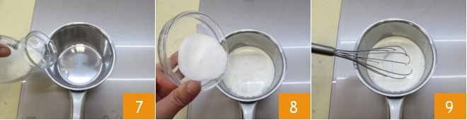 Poursuivez avec la préparation de la panna cotta. Dans une casserole à bord haut, versez la crème 7 et chauffez à feu doux. Ajoutez le sucre 8 et fouettez pour le dissoudre 9.