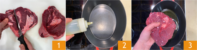 Pour préparer la joue de bœuf braisée, commencez par nettoyer soigneusement la viande, en éliminant la membrane en excès qui la recouvre 1. Chauffez une cocotte en fonte et versez un filet d'huile au fond 2, puis déposez-y les joues de bœuf 3 et faites-les dorer à feu vif pendant 2-3 minutes de chaque côté, jusqu'à ce qu'elles prennent couleur.
