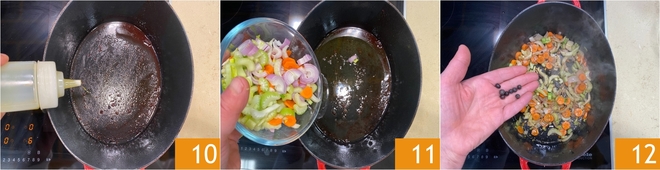 Chauffez à nouveau un filet d'huile dans la même cocotte 10 et versez-y les légumes 11, en les laissant mijoter doucement pendant quelques minutes. Ajoutez les clous de girofle et les baies de genièvre 12.