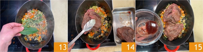 Ajoutez également la feuille de laurier et la branche de romarin 13, laissant libérer leur parfum. À ce stade, déposez à nouveau la viande dans la cocotte 14 et ajoutez le fond de cuisson que vous aviez réservé 15.