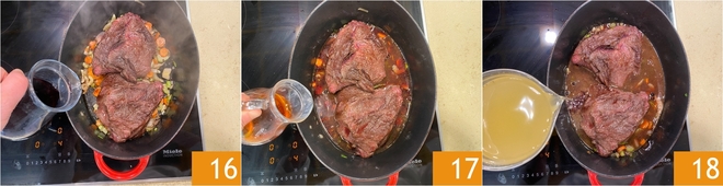 Versez aussi les 250 g restants de Barolo 16, le Marsala 17 et enfin le bouillon de viande chaud 18.