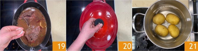 Assaisonnez de sel 19, couvrez avec un couvercle 20 et laissez cuire à feu moyen-doux pendant au moins trois heures et demie, en retournant la viande toutes les demi-heures avec une pince 27. Pendant ce temps, préparez la purée : mettez à bouillir les pommes de terre avec la peau 21, cela prendra environ 30-40 minutes.