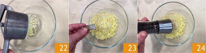 Une fois cuites, écrasez-les encore chaudes avec un presse-purée 22. Assaisonnez avec une pincée de noix de muscade 23, du sel et une pincée de poivre 24.