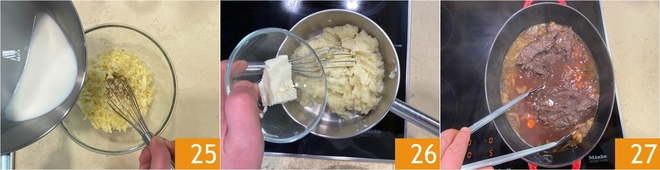 Chauffez le lait dans une petite casserole et ajoutez-le aux pommes de terre 25, transférez le tout sur feu doux en mélangeant avec un fouet pour obtenir une consistance moelleuse 25. Ajoutez le beurre 26 et continuez à travailler la purée jusqu'à ce qu'elle devienne crémeuse. Quand la viande est prête 27, retirez-la de la cocotte.