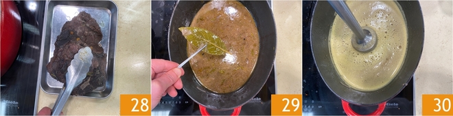 Gardez la joue au chaud 27. Éliminez le romarin, le laurier et les baies de genièvre restants dans le fond de cuisson 29, puis mixez le tout avec un mixeur plongeant jusqu'à obtenir une sauce lisse 30.
