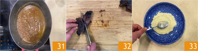Laissez-la réduire sur le feu pendant au moins 30 minutes, jusqu'à ce qu'elle devienne épaisse et veloutée 31. Avant de servir, coupez la viande en morceaux 32 et disposez la purée sur l'assiette 33.