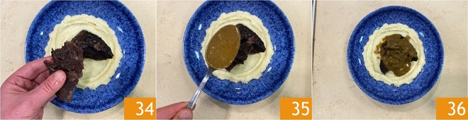 Déposez dessus les joues 34 et complétez avec une abondante sauce chaude 35. Servez immédiatement la joue de bœuf braisée 36.