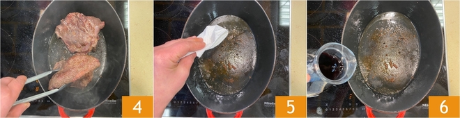 Lorsqu'elles sont bien dorées, retirez-les de la cocotte 4, éliminez le gras résiduel et tamponnez avec du papier absorbant le récipient 5. À ce stade, versez 100 g de Barolo 6.