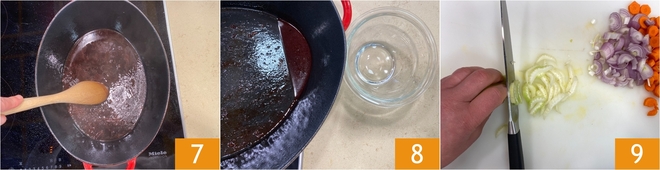 Déglacez le fond en vous aidant d'une cuillère en bois 7. Réservez le fond obtenu, en le transférant dans un bol 8. Préparez maintenant les légumes : coupez grossièrement le céleri, les échalotes et les carottes 9.