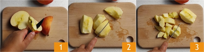 Pour préparer le jus de pomme fait maison, lavez très bien les pommes Gala, épluchez-les, enlevez le trognon 1 et coupez-les en morceaux 2 3