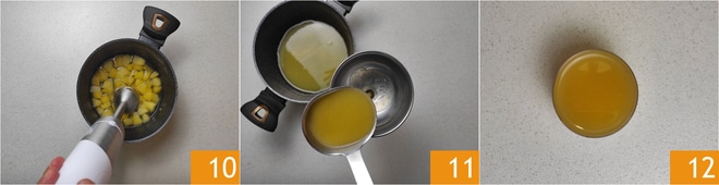Une fois le temps de cuisson des pommes écoulé, mixez le tout avec un mixeur plongeant 10, afin d'obtenir un jus homogène. Transvasez le jus dans des bouteilles propres et conservez-le au réfrigérateur pour le servir frais 12.