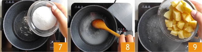 Dans une casserole à bords hauts, versez l'eau et le sucre 7, portez à ébullition pendant 3 minutes en remuant avec une cuillère 8. Ajoutez les pommes coupées en morceaux 9 et continuez la cuisson pendant 15 minutes à feu moyen.