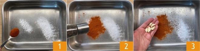 Pour réaliser le kebab maison, commencez par préparer la marinade pour la viande : dans un grand plat, versez le sel, le paprika 1, le poivre 2 et les gousses d'ail épluchées et légèrement écrasées 3.