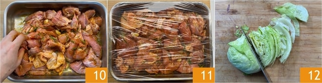 Frottez la viande avec vos mains pour bien l'enrober de marinade 10, puis couvrez de film plastique et laissez mariner au réfrigérateur pendant au moins 4 heures 11. Vers la fin du temps de marinade, préparez les légumes : lavez la laitue et coupez-la en lanières 12.