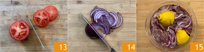 Lavez et coupez également les tomates en tranches 13. Épluchez l'oignon et tranchez-le finement 14, puis plongez-le dans un bol d'eau avec des glaçons et le jus des 2 citrons pour atténuer son goût piquant 15.