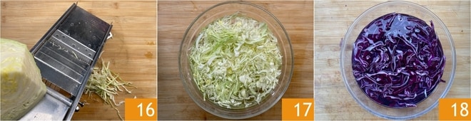 Enfin, coupez le chou blanc avec une mandoline 16 et plongez-le dans de l'eau froide 17. Faites de même avec le chou rouge 18.