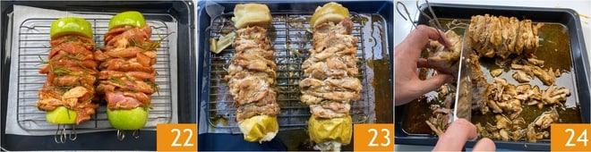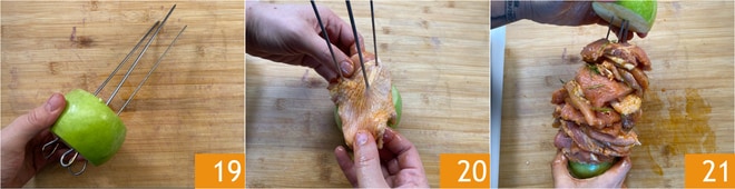 Sortez la viande du réfrigérateur. Prenez une pomme et enlevez la partie inférieure et supérieure, puis divisez-la en deux horizontalement. Insérez 3 brochettes en acier dans une demi-pomme 19, puis embrochez les tranches de viande, en alternant le poulet avec le veau 20. Une fois arrivé à la fin, fermez la brochette avec l'autre demi-pomme 21. Procédez de la même manière pour former la deuxième brochette.