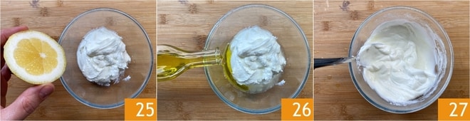 Enfin, préparez la sauce au yaourt : versez le yaourt grec dans un bol, puis ajoutez le jus de citron 25 et l'huile 26 et mélangez bien 27. Si vous le souhaitez, vous pouvez ajouter quelques gouttes de tabasco.